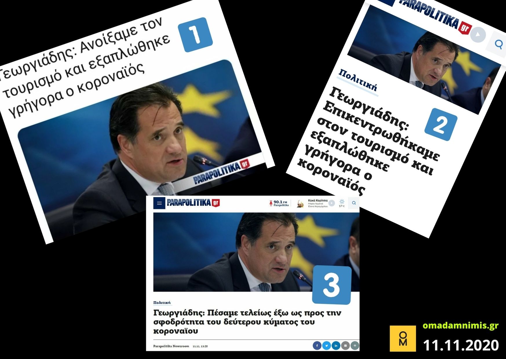 Μεταξύ αυτών και τα Παραπολιτικά, τα οποία δημοσιεύσαν, αρχικά, τη συνέντευξη του Υπουργού με τίτλο “Γεωργιάδης: Ανοίξαμε τον τουρισμό και εξαπλώθηκε γρήγορα ο κοροναϊός”.